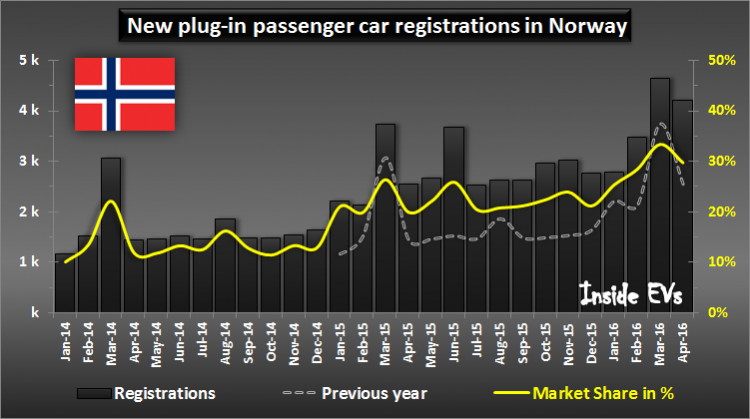 Norway Plug-In Electric Car Sales Up By 65% To 4,200(May 12, 2016)
