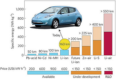 Lithium-sulfur batteries (Li-S) can hold as much as five times the energy per